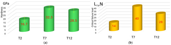 The results of changing the hardness of the coatings show that the T7 coating has the maximum hardness (32.3 ± 1.7 GPa) (Figure 3a). This result correlates well with the data [10,11,12,13,14,15,16] showing that the hardness of the (Ti,Al)N coating increases with an increase in the aluminum content to 60–70 at.%, but with a further increase in the Al content, the hardness begins to decrease, which is confirmed by the results of measuring the hardness of the T2 coating (16.7 ± 0.8 GPa). The hardness of the T12 coating with a dominant titanium content is 28.5 ± 1.1 GPa. The results of the study of fracture resistance in the scratch test correlate sufficiently with the hardness data (Figure 3b). The T7 coating has the best resistance to fracture (complete destruction is not observed under a load of 40 N). The T2 coating has the lowest fracture strength (it breaks under a load of LC2 = 14 N). The T12 coating breaks under a load of 28 N.