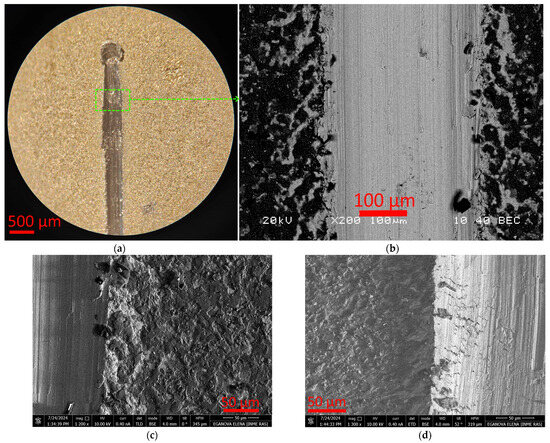 Analysis of the scribing groove of the T2 coating (Figure 4) shows the absence of noticeable delaminations from the substrate. Since the coating is quite soft, there is a denting of the coating, accompanied by partial chipping along the boundaries of the groove (Figure 4b–d).