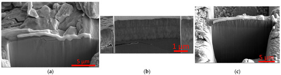 For cutting out the lamellae, areas on the border of the scribing groove were selected (Figure 7). These areas allow us not only to study the structure of the coatings, but also provide an opportunity to study the nature of the destruction of the coating and adjacent layers of the substrate under the influence of the movement of the indenter during the scratch test.