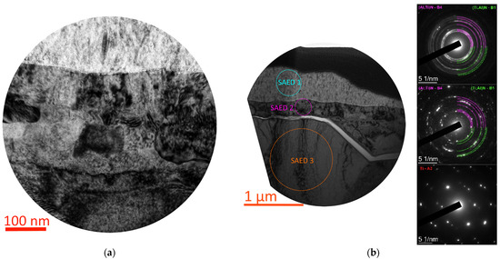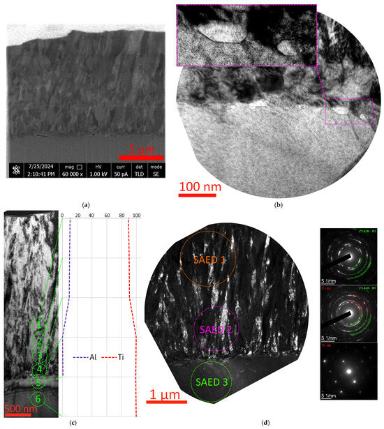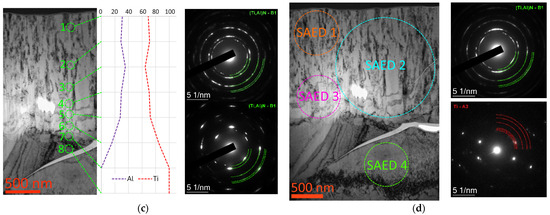 The study of the interface region of the T2 coating and the substrate reveals a complex, multilayered structure of this region (Figure 8a). As a result of the SAED phase analysis (Figure 8b) and the analysis of the change in the elemental composition (Figure 8c,d), three regions can be distinguished: