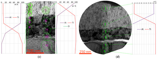 In the structure of the interface between the T12 coating and the substrate, pores (nanocavities) and light-contrasting grains (possibly also remnants of the oxide layer) up to 50 nm in size are observed (Figure 11a,b). The phase composition is dominated by (Ti,Al)N B1, but metallic titanium Ti A3 is also present at the boundary with the substrate (Figure 11d). In the structure of the substrate, at the boundary with the coating, there is a light-contrasting layer with an insignificant (up to 1 at.%) diffusion of aluminum (Figure 11c, point 5). The presence of pores and larger grains at the boundary of the coating and the substrate can cause the relatively low adhesion of the T12 coating.