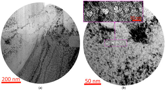 The study of the coating–substrate interface structure in sample T7 shows that a strong adhesive bond is maintained between them (Figure 9a). Directly at the boundary of the coating and the substrate, a layer of grains 3–10 nm in size is observed, possibly residual titanium oxide (an accurate determination of the composition is impossible due to the small grain sizes) (Figure 9b).