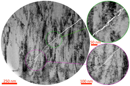 The study of the nature of the T7 coating destruction during the scratch test showed the tendency of this coating to crack formation. The nature of crack propagation in the coating under consideration is shown in Figure 10. The crack trajectory is directed at an angle close to 45° to the substrate surface. The coating layers associated with its periodic thermal activation do not have a significant effect on the crack development. Moreover, it can be seen that the crack development is influenced by the crystalline structure of the coating (Figure 10, upper right inset). When passing through stronger grains, the crack can change its trajectory or bypass (“flow around”) these grains. In this case, the crack does not completely cut through the coating structure. It is worth noting that this type of crack development differs significantly from the type of crack development in coatings with a nanolayer structure, where interlayer interfaces can slow down the crack development by changing its trajectory [54,55,56,57].