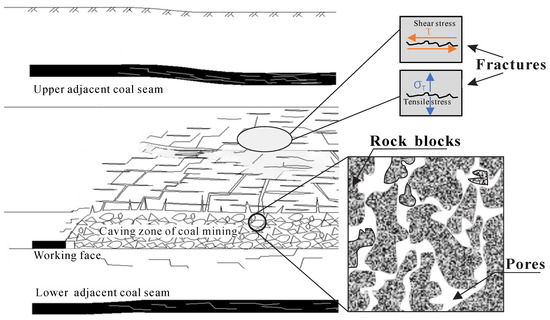 After coal mining, the overlying strata gradually collapse and form a mining-induced fracture field (Figure 1), included in the goaf. After the overlying coal seam mining, there is fracture development both above and under the caving zone. The fractures are subjected to combined shear/tensile stress [38]. The shear and tensile deformation of fractures result in a dramatic change in the permeability, which is related to the change in the fracture aperture. There are two interactive behaviors, including shear dilation aperture, caused by shear slippage and the normal aperture change due to tensile failure [39].