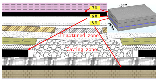 The 3DEC three-dimensional discrete element method was used to simulate and analyze the development law and evolution process of the overburden fracture field in the goaf, which can provide guidance for drilling and gas drainage design [42]. Figure 2 shows the numerical geometric model structure with working face 28202 as the prototype.