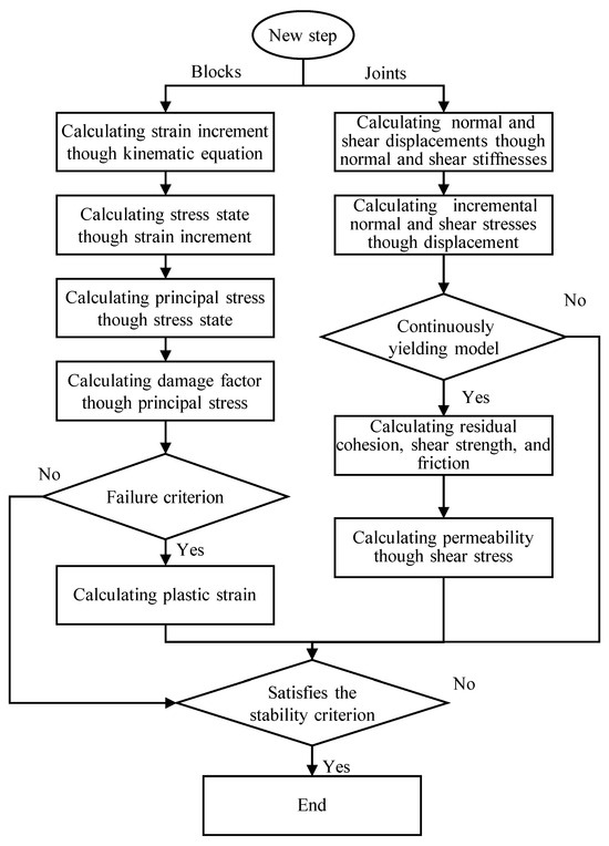 Early distinct element codes assumed that blocks were rigid. However, the importance of including block deformability has become recognized, particularly for stability analyses of underground openings and studies of seismic response of buried structures. The Mohr–Coulomb model was formed based on the maximum shear stress to predict shear damage, and is widely used. However, the Mohr–Coulomb (M–C) strength criterion is a linear criterion, which cannot accurately describe the nonlinear properties of the rock strength under different confining pressures. Therefore, this paper attempts to incorporate the nonlinear response into the M–C strength criterion to overcome the above limitations. The modified Mohr–Coulomb strength criterion and the statistical damage constitutive model were proposed in the simulation. The damage constitutive model was used to characterize coal block damage and deformation, and a code file “Damage_mechanical_model.dll” for the damage model was developed using C++ UDM (User-Defined constitutive Models) subroutine. The Mohr–Coulomb slip model is used for fracture deformation in this paper. The Coulomb slip model requires six parameters: normal and shear stiffness, friction angle, cohesion, tensile strength, and dilation angle. The permeability distribution is calculated based on exported data of shear stress for all joints. The flow diagram of the calculation cycle in 3DEC is shown in Figure 3.