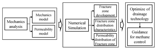 Excavation in one zone is of great consequence in controlling the stability of adjacent coal seams. Additional coupling of the effects of stress, permeability, and desorption provides potential positive feedback to the liberation of gas. The evolution and distribution of mining-induced fractures during mining have been investigated, but their effects on the subsequent gas drainage remain to be studied [10,11]. Studies have established the discriminant principles and methods for high-level annular fractured bodies using real-time monitoring and numerical simulation approaches [12,13,14,15]. Qian and Xu [16,17] studied the distribution characteristics of mining-induced fractures in overlying strata and put forward the O-shaped circle theory for mining-induced fractures. An O-shaped circle of the overburden was found to be an effective area for gas pressure relief drainage. Based on this, Lin et al. [8] proposed a simplified engineering model of mining-induced fractures with rounded corners and rectangular ladder belts, and analyzed the factors influencing the morphology of the mining-induced fracture zone.