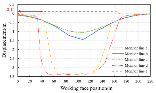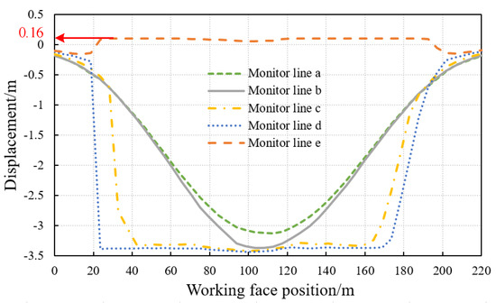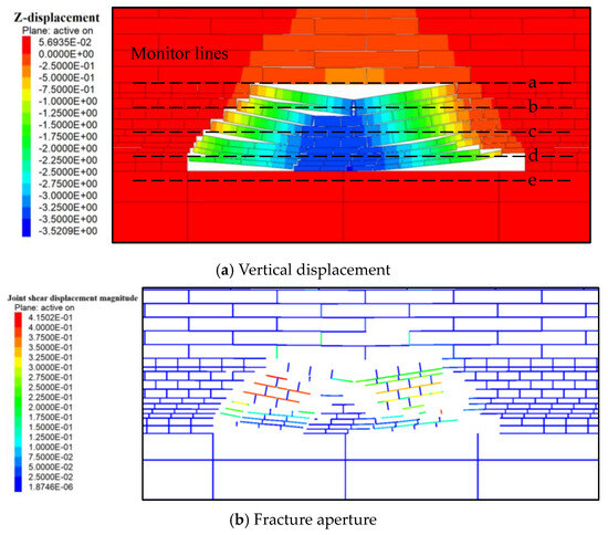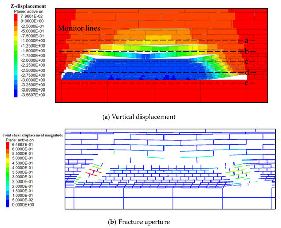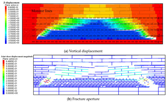Distribution of displacement and fracture aperture after working face advanced to 65 m. (Line a, b, c, d, and e are monitor lines).