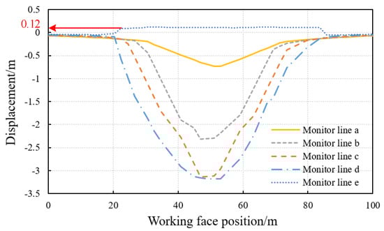 The curves of vertical displacement at different heights of rock strata after working face advanced to 120 m.