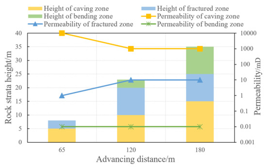 The numerical simulation results showed that with the advance of the working face, the fracture zone in the goaf evolves temporally and spatially. Hence, the predicted distribution of the fracture zones allows for the estimation of where the gas drainage can be effectively performed. Figure 11 shows the heights of the three typical zones varying with the advancing distance of the working face. The thickness of the three zones at different depths increases with increasing advancing distance. However, the permeability evolution of the three zones depends on the stress states that change with coal mining. This indicates the fracture and permeability evolutions with time and space during the mining of a coal seam.