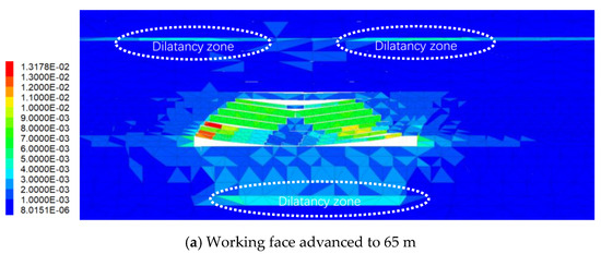 Under the condition of close-range coal seam groups, the coal seam above and below a certain range of mining produces fractures due to the stress relief, thus forming a high-permeability area. In a close-distance coal seam group, the adjacent coal seams are under more severe stress relief effects. Figure 12 shows the shear strain distribution in the upper and lower adjacent coal seams during the advance of the working face. As shown, the stress relief laws of mining on the upper and lower adjacent coal seams are different. The stress is gradually relieved in the lower and upper adjacent coal seams. Above the overburden collapse zone, because the tensile strength in the strata was much greater than the strength of the interlayer bedding, the strata bent and sank, leading to a shear deformation between the strata. The coal seams had a lower relative strength and greater shear strain. The adjacent coal seams had a varying shear strain concentration area as the working face advanced. In the upper adjacent coal seam, the shear strain was mainly concentrated above the permanent and moving boundaries, and the concentration area of the shear strain moved continuously with the advance of the working face. However, the lower adjacent coal seam was below the goaf, and the influencing range increased with the advance of the working face.