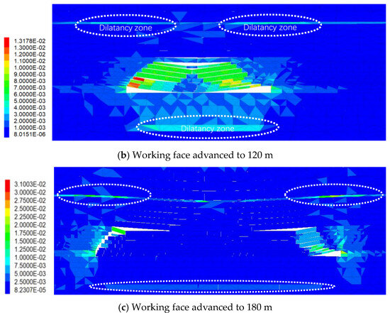 As the working face continued to advance, the overlying strata collapsed periodically. Behind the new caved strata, the old fractures closed, the collapsed rock mass in the middle of the goaf was compacted, and the collapse swelling rate of the caved strata was reduced. As shown in Figure 9 and Figure 10, when the advance reaches 180 m, the range of collapsed overburden continues to increase, the floor continues to bulge, the vertical displacement is 16 cm, and the bending band extends to a large range. The fracture was well developed. In the goaf boundary region, the fracture opening was large, and the separation layer existing in the bending zone also increased the fracture opening. The rock stratum dislocation at the goaf boundary location caused a shear deformation of the fracture, resulting in the formation of a gas seepage channel. A shear failure zone surrounding the shearing fracture is gradually developed during shear, in which the failed fractures have greater apertures than the undamaged fractures due to shear-induced dilation.