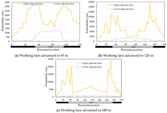 Due to the dilatancy effect of the mining-induced fractures, the permeability of the fractures increased exponentially during shearing. Figure 13 shows the distribution patterns of the upper and lower adjacent coal seams. In the upper and lower adjacent coal seams, the permeability increased within 40 m of the goaf boundary, and the increase of the permeability became more significant as the working face advanced. When the working face advanced to 65 m, the permeability increased by 4000 times, whereas it increased by 20,000 times when the working face advanced to 180 m. The area where permeability increased was expanded as the working face advanced.