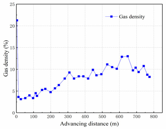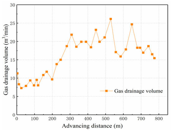 Figure 15 and Figure 16 show the changes in the gas concentration and drainage volume in the high-level suction roadway of working face 28202. During the initial production period of the working face, the surrounding rock above the goaf had not completely collapsed, and the gas in the goaf had not entered the high-level suction roadway, because of which the gas concentration in the high-level suction roadway was below 5%, and the absolute gas emission was less than 10 m3/min. After advancing to 114 m, with the bending and fracture of the goaf overlying strata, a fracture channel was formed between the high-level suction roadway and goaf in the upper fracture zone of the goaf, gradually increasing the gas concentration in the roadway. This zone is more permeable than other areas, which is responsible for the enhancement of permeability. As the working face continued to advance to a range of 300–500 m, the surrounding rock at the upper part of the working face periodically collapsed, resulting in a gradual increase in the gas concentration in the high-level suction roadway during this period, while the absolute gas emission was stable at approximately 9%. When the advancing distance of the working face was more than 600 m, the absolute emission amount of the gas drainage from the high-level suction roadway decreased slightly with the decrease in the air distribution volume.