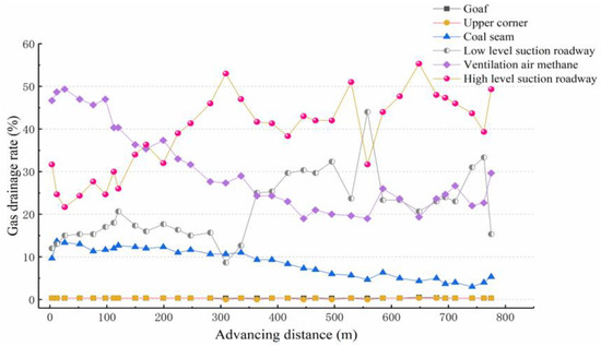 Figure 17 shows the ratios of the gas emission by air exhaust, high-level suction drainage roadway, low-level suction drainage roadway, drainage in this coal seam, buried pipe drainage in the upper corner, and buried pipe drainage in the goaf. As observed, when working face 28202 was in the initial stage of mining (less than 120 m), the contact channel between the high-level suction drainage roadway and the working face goaf was not well ventilated, and the gas was mainly drained by air exhaust on site while the gas drainage of the high-level suction drainage roadway accounted for approximately 20% of the total gas emission of the working face. However, when the working face reached full mining along the strike, the contact channel between the high-level suction roadway and the working face goaf was well ventilated, as discussed above, and the gas drainage of the high-level suction drainage roadway reached 40%–50% of the total gas emission of the working face in the normal production period. Based on the evolution and distribution law of the overlying strata mining-induced fracture field under mining conditions, after the arrangement of the high-level suction drainage roadway, the drainage effect was significant, and the gas influx into the mining space of the goaf and surrounding coal-rock mass was effectively cut off. This helped maintain a high and stable yield of the working face while ensuring safety.