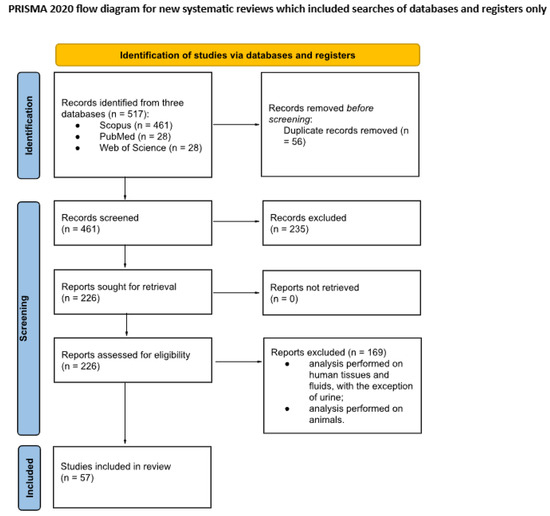A total of 517 publications initially met the search criteria. After removing 56 duplicates, 235 additional studies were excluded based on primary inclusion criteria, resulting in 226 full-text articles. Studies specifically examining nandrolone’s presence in human urine were selected, leading to the exclusion of 169 more articles. Thus, 57 full-text articles ultimately met all inclusion criteria for this review. Figure 1 provides a summary of the article selection process.