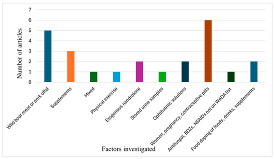 Out of a total of 57 articles, only 24 were concerned with factors influencing endogenous nandrolone production. The factors investigated in these studies are shown in Figure 3. These are as follows: wild boar meat or pork offal (5); supplements (3); mixed (post-menopausal women and male athletes) (1); physical exercise (1); exogenous nandrolone (2); stored urine samples (1); ophthalmic solutions (2); women, pregnancy, and contraceptive pills (6); antifungal, BDZs (benzodiazepines), and NSAIDs (nonsteroidal anti-inflammatory drugs) not featured on the WADA’s Prohibited List (1); and foodborne doping, including foods, drinks, and supplements (2).