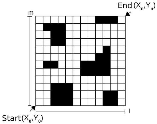 In our framework, we use a discrete environment representation. A grid box can have an obstacle or be empty, as shown in Figure 1. In this figure, the starting point is the bottom left corner and the ending point is the top right corner , where l is the width and m is the height of the grid.