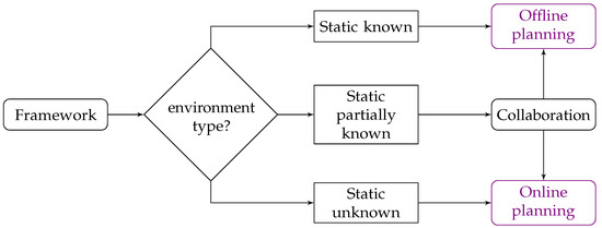 AdaptiveRMP components. According to the environment type identified: known, partially known, or unknown; the framework selects the algorithm to use.
