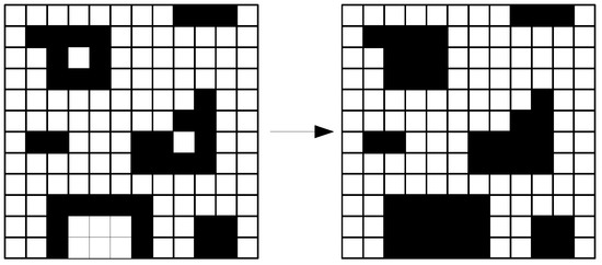 The SA algorithm implements two main steps: the pre-processing and the search. Before the initial solution is constructed, the empty cells that the robot cannot reach are marked as obstacles using the flood-fill algorithm [36] (line 1). Figure 4 shows the grid obtained after the flood-fill algorithm.