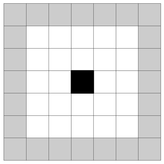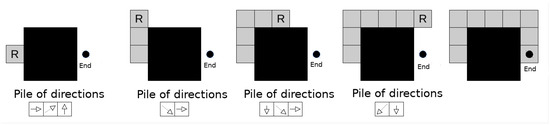 To solve the planning problem in an unknown environment, initially, the robot has the information in the map resolution and the starting and ending positions. Sensors enable the robot to discover two cells around it, as shown in Figure 9. Here, the robot is shown in black, white cells show the space that can be observed by the robot, and, in gray, those that are out of sight are shown.