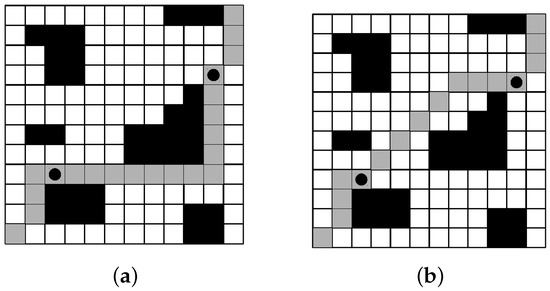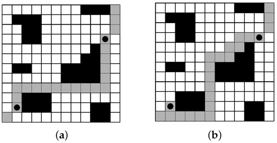 Figure 7 shows an example of obstacles between the two selected positions. As in Figure 6, circles show the randomly selected positions, the current path is shown in gray in (a), and the new route is shown in gray in (b). In this example, it is randomly decided to go around the right of the first object. The second obstacle is surrounded on the left.