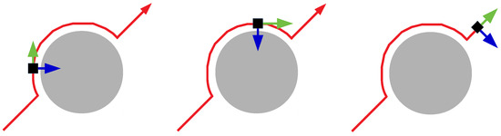 Given the limited vision of a robot, only a portion of the obstacle may be known when using the surrounding strategy. When new information is available, the robot will decide to go around to the object from the right or the left. This can cause the robot to become caught. For this, the normal vector for the movement direction and the obstacle is considered. Figure 10 shows the surrounding change as the robot moves around an obstacle. The black square represents the robot, the obstacle is in gray, and the path is in red. The current direction and its normal vector are shown in green and blue, respectively.