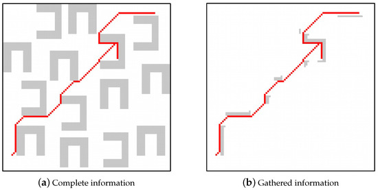 Figure 8 shows a solution path before the post-processing (a) and after the post-processing step (b). Here, the start and target cells are in blue, the solution path is in red, and the obstacles are in gray.