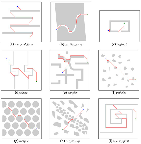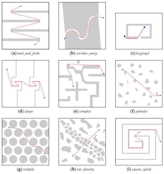 In [3], a hybrid approach is presented. Surrounding points set close to critical obstacles are used to find a path, and then particle swarm optimization is applied to improve such a path. When the robot approaches narrow spaces where a feasible path cannot be found, this approach considers more surrounding points, enlarging the grid resolution; if there exists a path, it will be found. The approach can obtain better results than probabilistic roadmap methods [12] and an ant colony optimization-based algorithm [21] solving instances of . In [22], a new hybrid planning algorithm is proposed. The approach, RRT*-CFS, combines sampling-based and optimization-based methods. Here, RRT* [23] is used to construct an initial feasible path, and then the convex feasible set algorithm is applied to solve the non-convex motion planing.