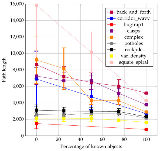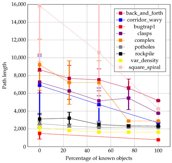The plots in Figure 20 and Figure 21 show the average path lengths with their corresponding standard deviations found for different degrees of known objects of the map for critical and non-critical problem instances, respectively. A clear tendency to length reduction is observed in both sets of instances. The most noticeable differences can be observed for the complex instance with 50% known objects, where an in-depth analysis shows that the critical object kept in the critical case blocks most of the direct initial path.