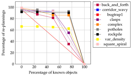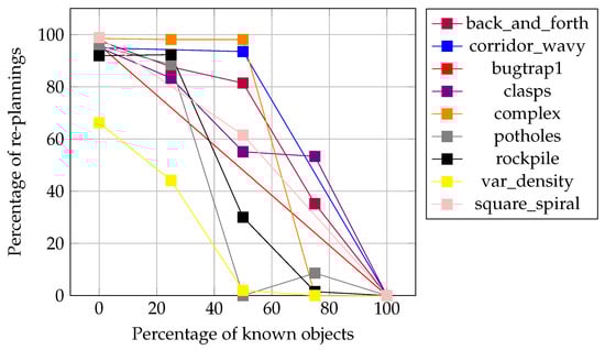 The plots in Figure 22 and Figure 23 show the changes in re-planning percentages considering the different degrees of known objects studied for both the critical and non-critical problem instances, respectively. The number of re-plannings reduces as the percentage of known objects increases. In this case, the reductions are more evident for the critical problem instances, whereas, for the potholes and var_density instances, the re-plannings drop to zero.