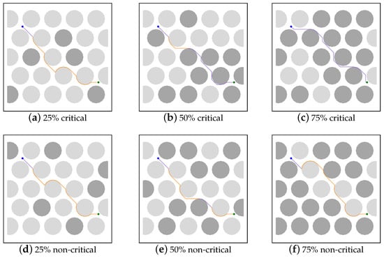 Figure 19 shows the differences between instances with 50% critical and non-critical objects. The known obstacles at the beginning are shown in dark gray. The unknown obstacles are shown in light gray. The blue points indicate the starts, and the green points indicate the targets. The purple route corresponds to the OfflineRMP route, and the orange corresponds to the OnlineRMP route.