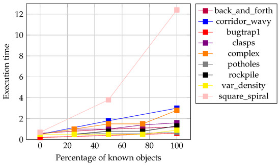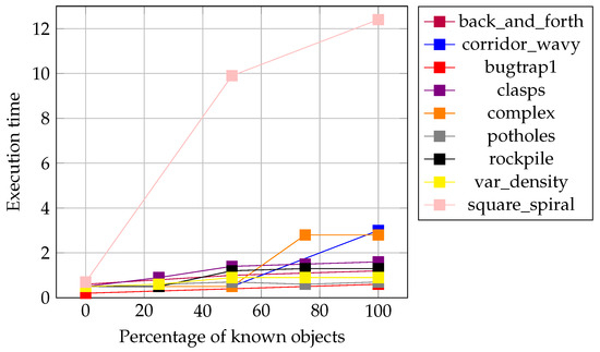 The plots in Figure 25 and Figure 26 show the execution time changes related to the different degrees of known objects studied for critical and non-critical problem instances, respectively. From these plots, we can easily observe a tendency to increase in computation time as the percentage of known objects increases. Excepting the square_spiral problem instance that reaches a maximum of 12.5 s with 100% known objects, all the other problem instances require at most 3 s of execution time. square_spiral is one of the most complex problem instances for the surrounding strategy that requires a higher number of re-plannings, but the most important is that those re-plannings require a great deal of computation due to large objects. Moreover, the algorithm demonstrates being able to escape from these labyrinths using low computational effort. Moreover, it is important to notice that the algorithm is efficient concerning execution times because costly strategies like surrounding flood-fill algorithms are used only in the presence of closer obstacles.