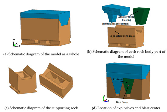 This study focuses on a selected portion of the underground mining blast production area. A three-dimensional model is constructed using software such as ANSYS and SolidWorks, with dimensions of approximately 30 m × 38 m × 50 m (X × Y × Z). The model is divided into three parts: the blasting fragmentation zone (blue), the area awaiting blasting (green), and the supporting rock mass (yellow). Figure 1 provides a schematic diagram of the model.