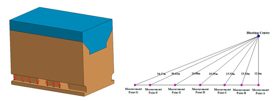 The model is divided into hexahedral grids, each with an approximate size of 0.125 m3. Part 1 consists of 271,068 units of supporting rock mass, Part 2 comprises 172,760 units of fragmented blasting deposits, and in Part 3, the number of particles in the area unit to be blasted after particlization is 322,112. Combined with on-site blasting tests, detection points are set every 5 m near the corners of the tunnels in the blasting area. Figure 2 illustrates the grid division and vibration measurement point locations. The distances of each measurement point from the explosion center are listed in Table 1.