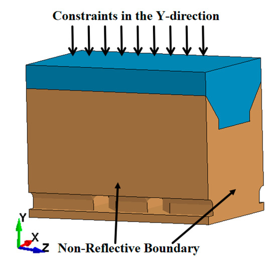 During large-scale blasting operations near underground tunnels, the vibration stress values fluctuate dramatically, and the magnitude of the in situ stress affects the propagation of vibration waves. In the blasting project, the magnitude of the ground stress load changes with the progress of construction. According to statistical analysis of on-site data from the underground mine, it was found that the ground stress in the blasting excavation area varies, with two scenarios of 1 MPa and 5 MPa. Therefore, these two ground stress conditions are applied to the model separately. The empty section of the tunnel is considered a free boundary. Reflective boundaries are set at the model boundaries in the X and Z directions to prevent wave reflections. The vibration source is the vibration generated by the explosive blasting, located in the middle of Part 3, with a downward gravitational acceleration of 9.8 m/s2. The initial boundary conditions are loaded into the model as shown in Figure 4.