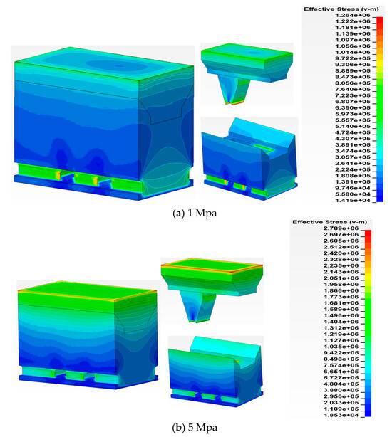 During blasting operations near underground tunnels, the induced vibration stress values fluctuate significantly, with in situ stress values for cases of in situ stress of 1 MPa and 5 MPa. In the Y direction (plumbline direction), vertical downward in situ stress loads are applied to the tunnel model. The equivalent stress states of the model under initial in situ stress loads of 1 MPa and 5 MPa are illustrated in Figure 5.