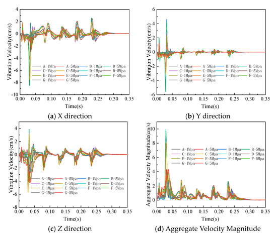 According to the data in Figure 6, within 0–2.5 s, as the blasting proceeds, the explosives detonate successively, resulting in severe fluctuations in the vibration velocity at various measurement points. When the blasting process ends within 2.5–3.5 s, the vibration velocity gradually decreases to 0 cm/s. Under a stress condition of 1 MPa, the vibration velocity in the X direction, perpendicular to the tunnel, is greater than the maximum vibration velocity in the Y and Z directions at each measurement point. In the X and Z directions, the maximum vibration velocity forms new peaks or valleys 0.02 s after the detonation of each row of explosives, followed by a gradual decrease in the maximum vibration velocity in a wave-like pattern. In the Y direction, the vibration velocity reaches its maximum value of 5.41 m/s after the detonation of the first row of explosives and then rapidly decreases. During the subsequent detonation of explosives, the maximum vibration velocity fluctuates within the range of 0 to 0.01 m/s. Under stress conditions of 5 MPa, the absolute values of the maximum vibration velocities at various measurement points are greater than those under 1 MPa conditions, but the pattern of vibration velocity change is the same as that under 1 MPa conditions.