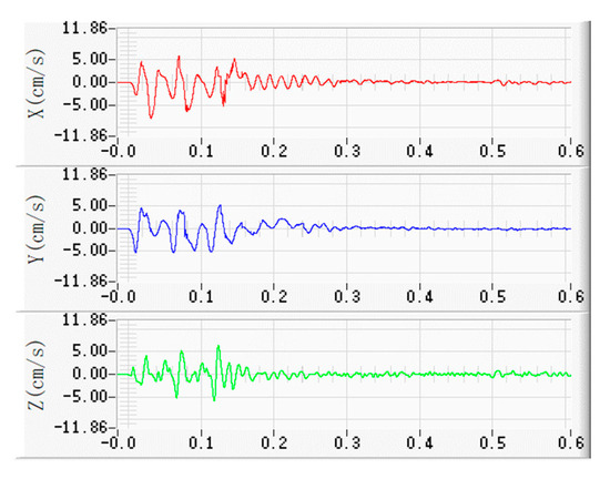 In an underground blasting project, the vibration wave generated by blasting will affect the stability and safety of the adjacent roadway. The mine carries out underground blasting mining works when the ground stress is 1Mpa, and the vibration monitoring points of the blasting site are respectively set in the interior of the adjacent roadway, at a distance of about 15m from the blasting point. Blasting site vibration monitoring points were set up in the adjacent roadway interior, about 15 m from the blast point. The orientations of the triaxial vibration sensors were as follows: X direction perpendicular to the tunnel sidewall, Y direction perpendicular to the tunnel floor, and Z direction parallel to the tunnel. The recording rate of the vibration sensors was 6000 sps, with a recording time of 4 s. In the collected vibration wave data, the maximum vibration velocity in the X direction (VX-max) was 10.454 cm/s, while in the Y direction (VY-max), it was 6.004 cm/s, and in the Z direction (VZ-max), it was 9.126 cm/s. The triaxial vibration velocity profile measured on-site is detailed in Figure 7.