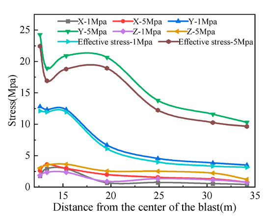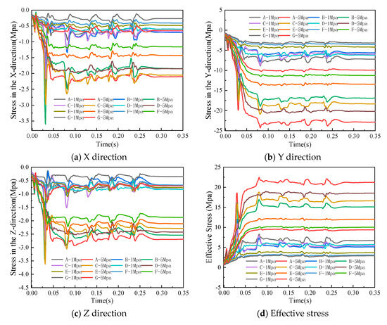 Using in situ stress values of 1 MPa and 5 MPa, respectively, we extracted the maximum values of stress in the X, Y, and Z directions and the effective stress direction for measurement points A to G. We then employed Origin to plot the curves showing stress variations with changes in the blast center. For specific results, please refer to Figure 10.