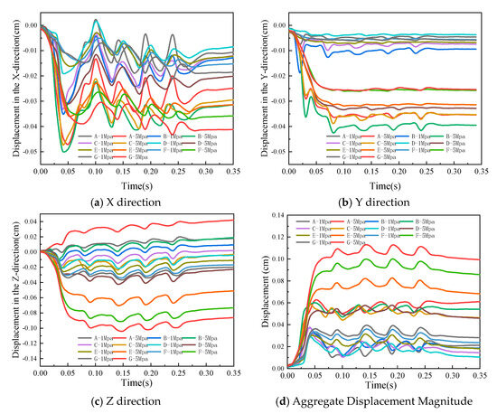 During the blasting process, the displacement changes at each measurement point are minimal. We only extracted and analyzed the extreme values and abrupt variations in the simulated results. Subsequently, the displacement histories of each measurement point under in situ stress conditions of 1 MPa and 5 MPa were plotted. For detailed results, please refer to Figure 11.