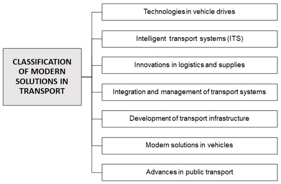 The literature provides numerous examples of solutions that have been successfully implemented in transport and widely embraced by society [18,19,20]. However, in an era of rapid technological advancement—where artificial intelligence (AI), advanced automation systems, the Internet of Things (IoT), and Big Data technologies [21,22] are increasingly influential—the emergence of new innovations is inevitable. Modern innovations, such as autonomous vehicles, unmanned aerial vehicles (UAVs) [23], and intelligent traffic management systems, are continually transforming the transport sector, making it more efficient, safer, and greener [24,25,26]. Research in the area of transport system models (TSMs) is also worth noting, as they not only can reduce risk but also increase evacuation preparedness in the event of disastrous events [27]. The classification of these modern transport solutions is not strictly defined and continues to evolve as new technologies emerge and research advances. Given the current state of knowledge, the classification in Figure 1 can serve as a useful framework.