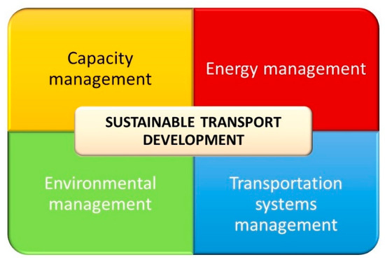 The principles of sustainable transport development can primarily be implemented through effective management of transport systems. This includes optimizing transport needs and improving the flow of passengers and goods [89,90]. Another key focus is capacity management, which aims to reduce society’s reliance on passenger cars. This can be achieved by promoting alternatives, such as public transport, cycling, and walking [91]. Minimizing environmental impacts is also crucial for sustainable transport development, primarily by reducing exhaust emissions, noise, and waste (e.g., oils and batteries) [92,93]. Furthermore, as shown in Figure 2, sustainable transport development can be facilitated by decreasing dependence on fossil fuels (energy management) through the use of electric vehicles, biofuels, or other alternative fuels [94,95].