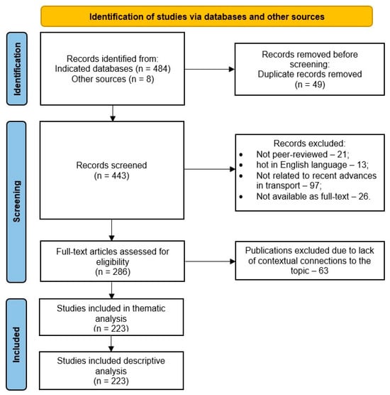 In this paper, a systematic literature review was conducted to identify the latest advances in sustainable transport development and to highlight their significance in the context of potential global crises. Four different databases were used for this purpose: Scopus, Google Scholar, DOAJ, and IEEE. The review was conducted between August and October 2024. The systematic review method employed in this publication is based on the approach outlined by Liberati et al. [96], which aligns with the PRISMA (Preferred Reporting Items for Systematic Reviews and Meta-Analyses) guidelines [97]. This methodology is also commonly used in studies by other researchers [54,98,99,100].