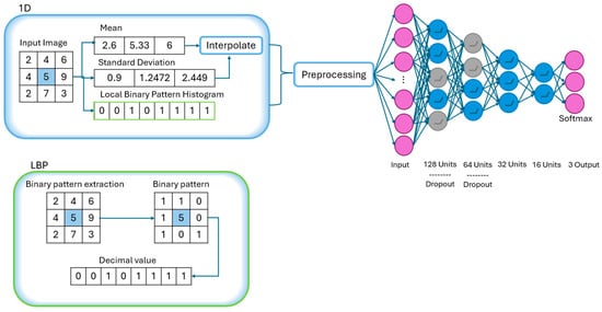 The process involves extracting features from an input image by calculating its mean, standard deviation, and binary pattern. Interpolation is used to ensure all features are the same length. The 1D data are then preprocessed using a standard scaler, and the string labels are converted into integers using a label encoder. Finally, the preprocessed data are passed to an FFNN model.