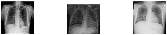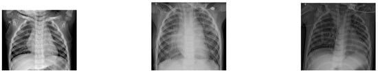 This method used two types of datasets to utilize the performance of the proposed framework. The first dataset is the Guangzhou Women and Children’s Medical Center dataset [], which consists of chest X-ray images of children formatted in JPEG with 5863 images. Each of the primary folders, train, test, and validation, has two subfolders: normal and pneumonia categories; the pneumonia images are divided into two labels, bacteria and virus. This dataset has already been split into 90% for training and 10% for validation. Figure 4 shows the samples of each class, normal bacteria and virus, respectively. On the other hand, the COVID-19, pneumonia, and normal chest X-ray PA dataset [] contains three classes: covid, pneumonia, and normal. Figure 5 illustrates the class of the PA dataset, normal, covid, and pneumonia, respectively. This dataset [] contains 4575 samples of children and adults, and it was split into 80:10:10 for training, testing, and validation, respectively.