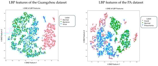 Figure 6 shows that it contains each dataset’s classes, separating each class depending on its features. The graphs clearly show how this feature can capture a distinctive attribute of the classes, especially with the normal class in the Guangzhou Women and Children’s Medical Center dataset [], since the features of the bacteria and virus of the first graph and pneumonia and COVID-19 in the second graph are similar to each other; this indicates the need for accurate classification of DL methods.
