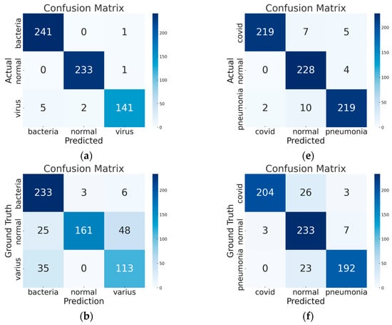 In addition, in PA, pneumonia and COVID-19 could be differentiated radiologically. Pneumonia looks like a localized, condensed consolidation opacity in one or more lung lobes. COVID-19, in its early stages, demonstrates bilateral, peripheral ground-glass cloudiness distribution without lobar dense consolidation. At late stages, the ground glass cloudiness progresses into consolidations with an “irrational paving” shape of interlobular septal thickening. Moreover, pleural effusions are likely present in pneumonia but uncommon in COVID-19 []. In the Guangzhou dataset, bacterial and viral pneumonia exhibits distinct radiological characteristics. Radiographically, bacterial pneumonia is typically a focal lobar consolidation seen in one lobe. In contrast, viral pneumonia generally presents with a more diffuse “interstitial” pattern across both lungs [].