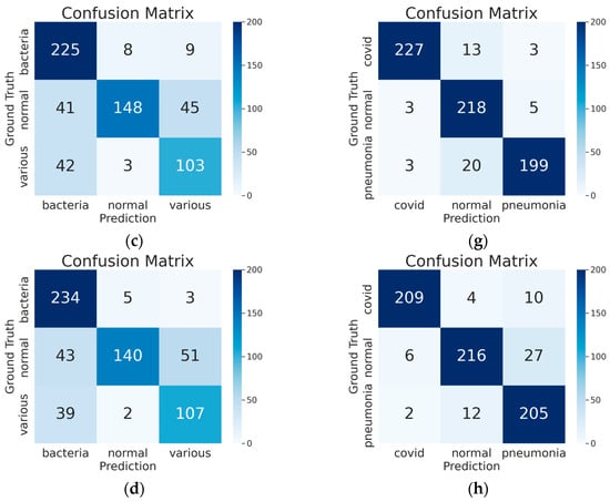 Confusion matrix of each experiment, comparing the performance of 1DTR with the neural network models (EfficientNet, EfficientNet-V2-Small, and MobileNet-V3-Small). (a) 1DTR Guangzhou dataset confusion matrix. (b) EfficientNet Guangzhou dataset confusion matrix. (c) EfficientNet-V2-Small Guangzhou dataset confusion matrix. (d) MobileNet-V3-Small Guangzhou dataset confusion matrix. (e) 1DTR PA dataset confusion matrix. (f) EfficientNet PA dataset confusion matrix. (g) EfficientNet-V2-Small PA dataset confusion matrix. (h) MobileNet-V3-Small PA dataset confusion matrix.