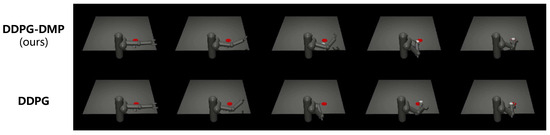 - Developing a novel RL approach specific for robot control tasks by integrating DMP-based policy and DDPG’s on-policy actor–critic framework. It enhanced the learning capability and the sample efficiency compared to the related work on NDPs [30], which inherits the off-policy characteristics of PPO.